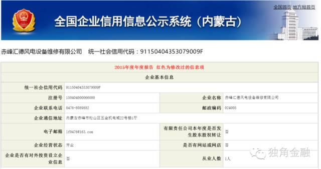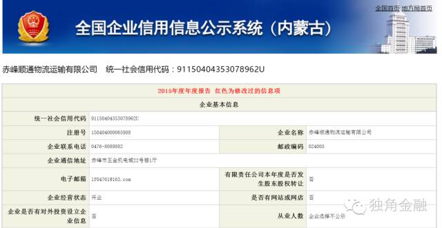 对此,独角金融在全国企业信用信息公示系统进行查证,赤峰顺通物流运输有限公司与赤峰汇德风电设备维修有限公司2015年度报告显示如下: